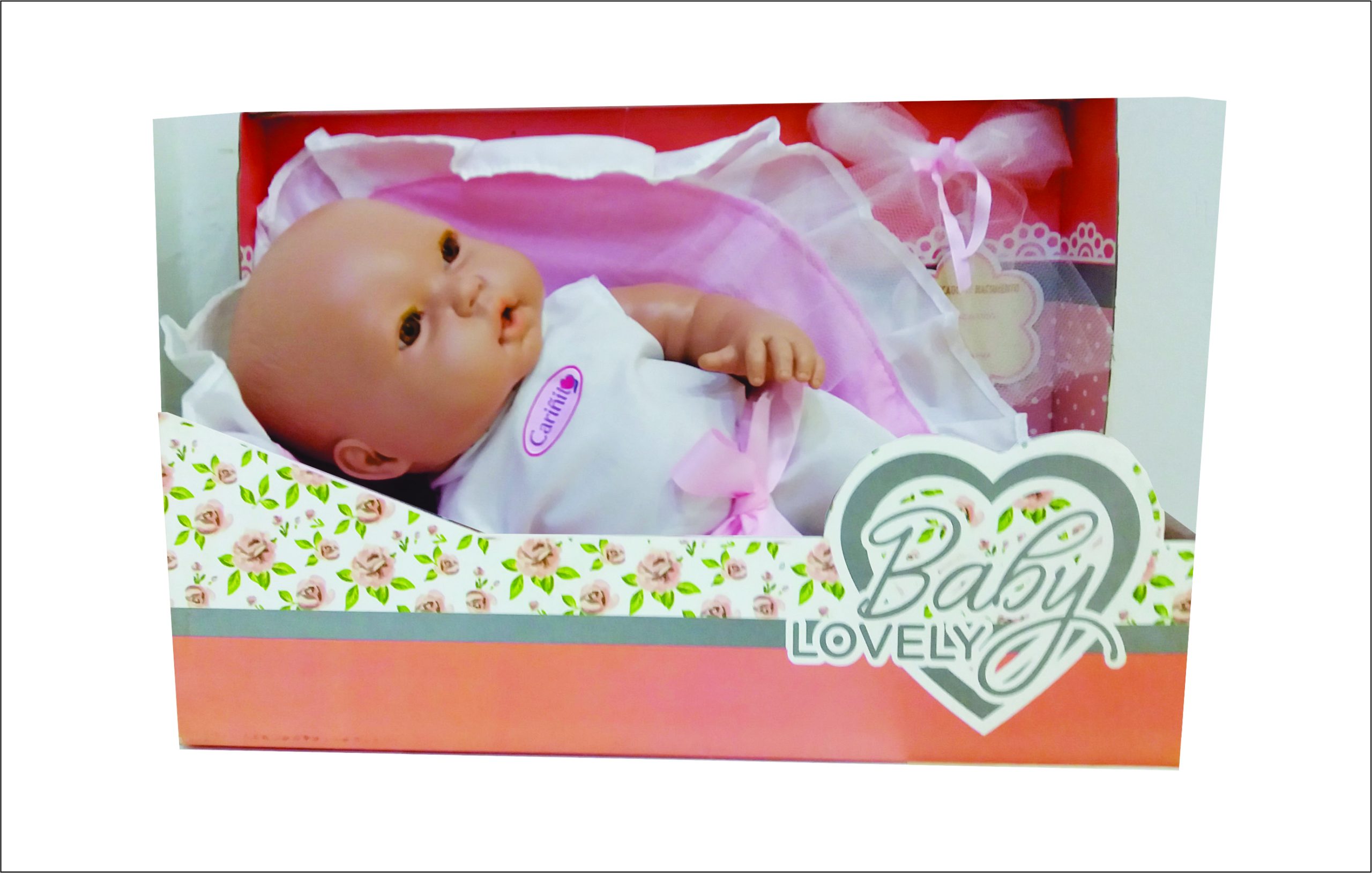 BABY LOVELY GRANDE, mide 34 cm, ojos fijos, con enterito, escarpines, incluye mantita para dormir, tarjeta de nacimiento, cuerpo y extremidades en plastisol (semi blando).