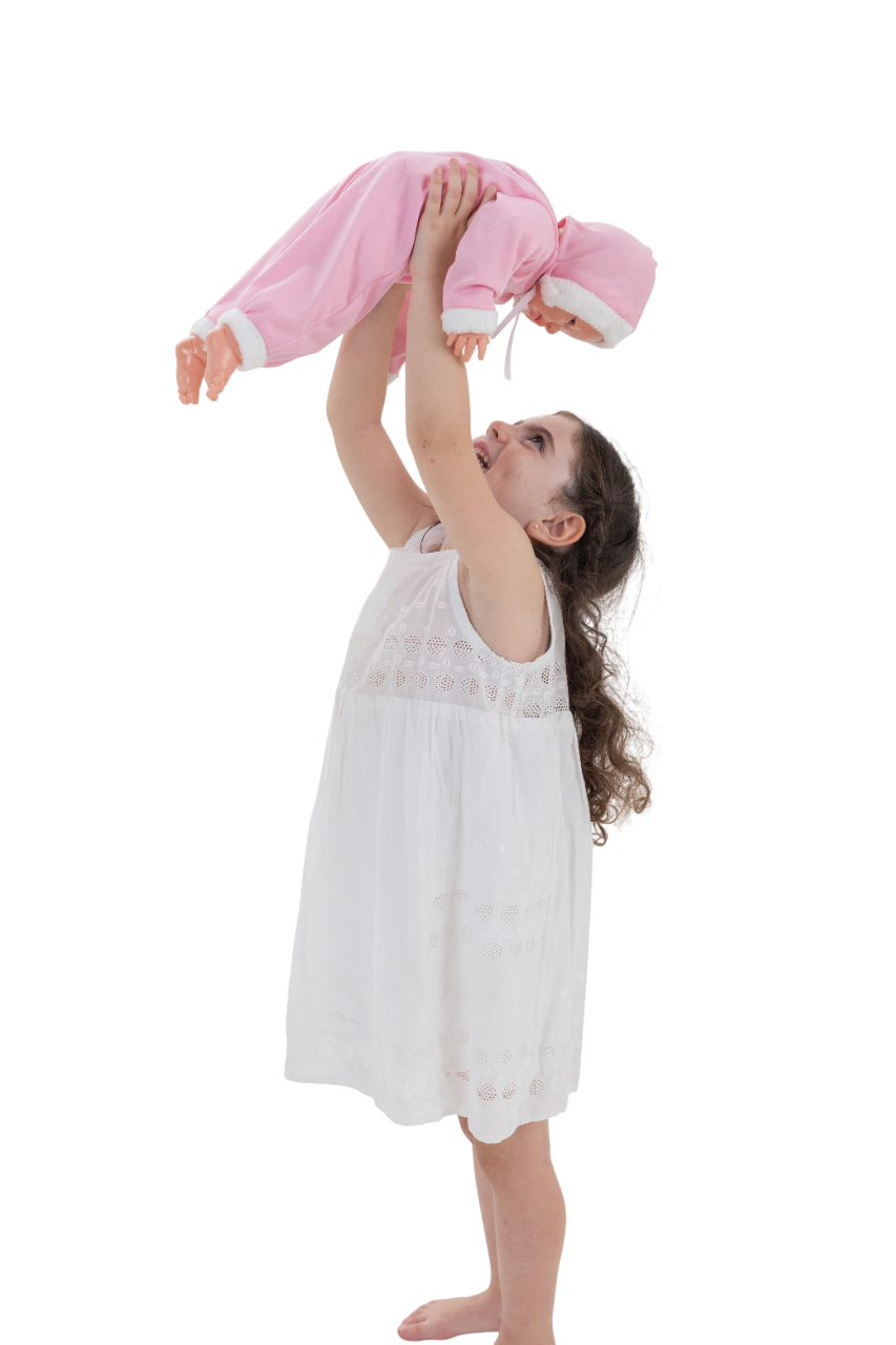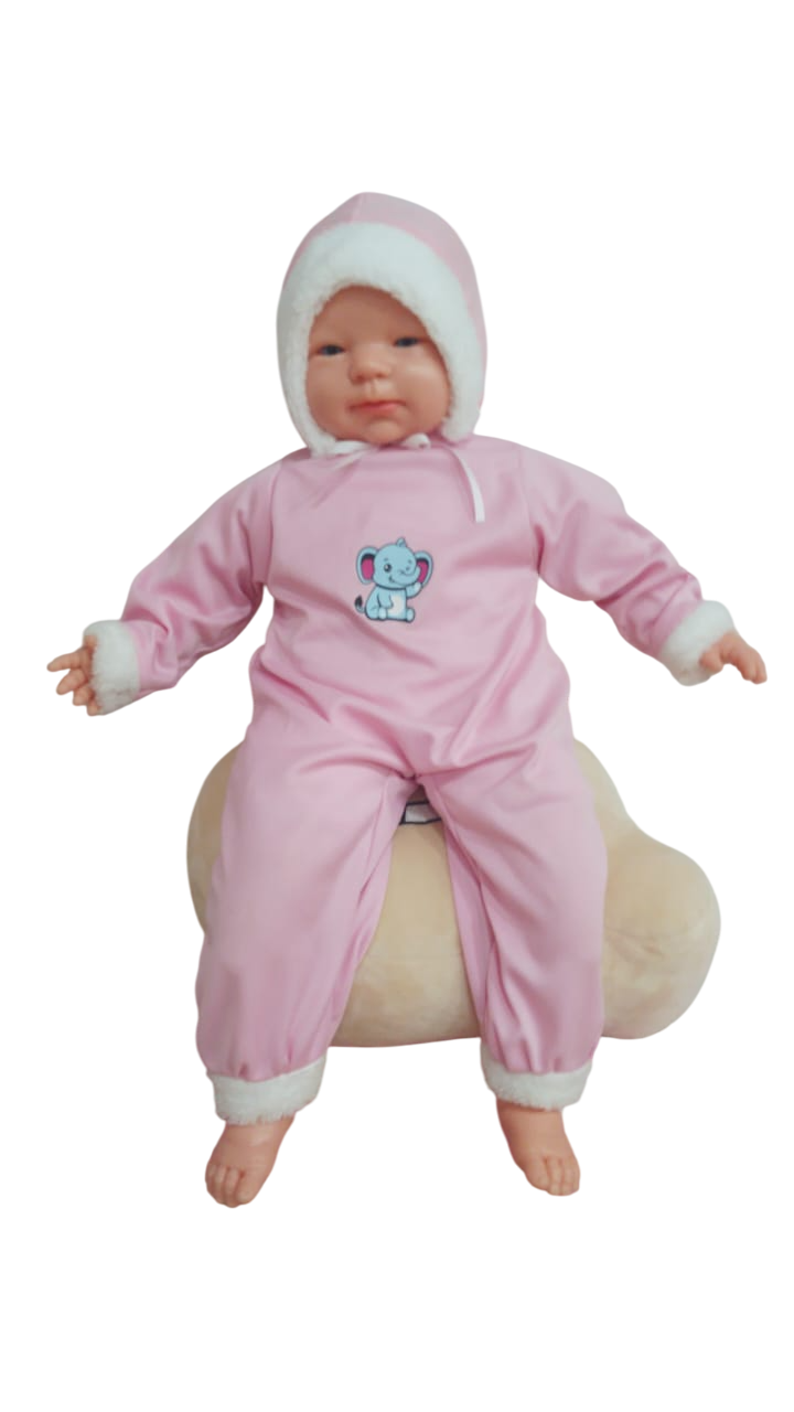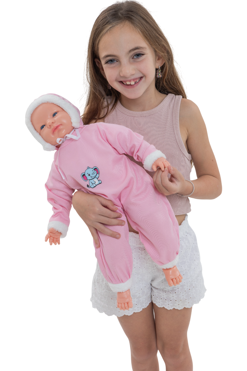 BABY UPA bebe cuerpo de tela relleno (blandito). Piernas, cabeza y brazos en plastisol. ojos fijos. Con mecanismo que cuando lo lanzas al aire se ríe, lo pones boca abajo y llora, sonidos de bebé. Mide 50 cm. En estuche visor.