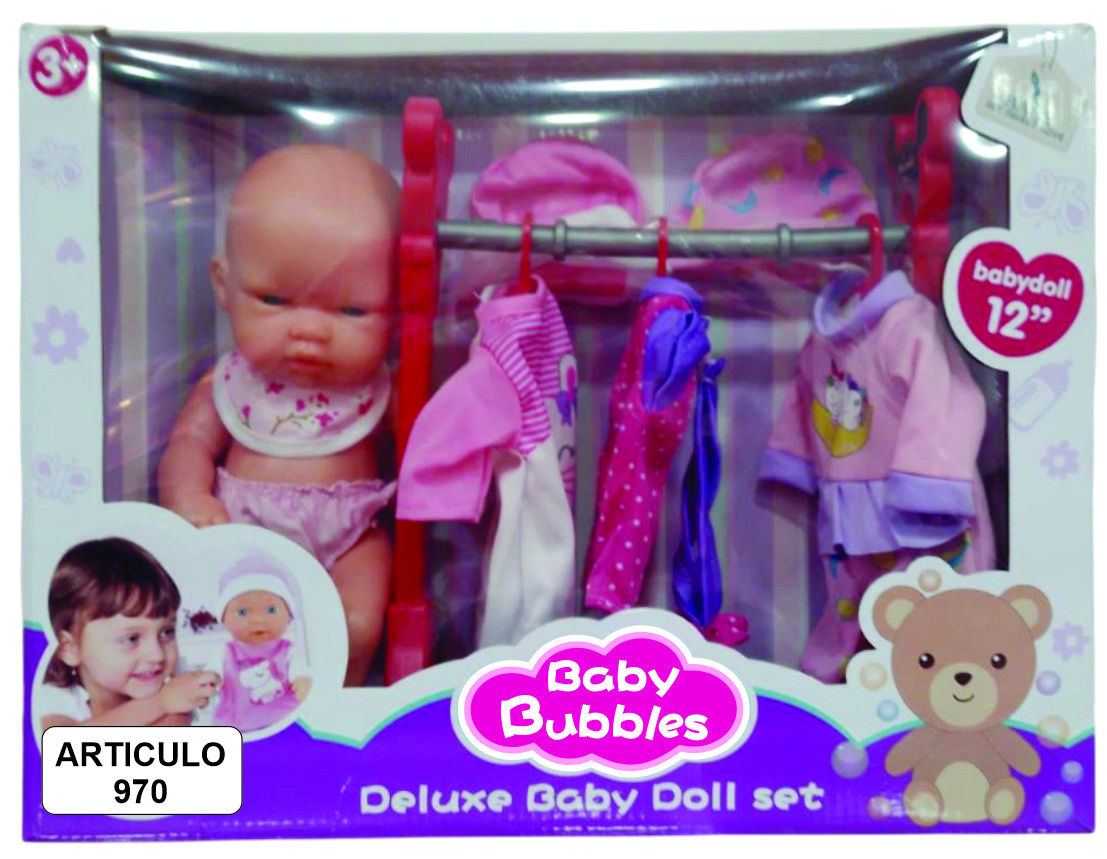 BABY BUBBLES,OUTFIT ,Bebe de 12 pulgadas en plastisol semi blando, ojos fijos, con pañal incluye perchero en plástico rígido y 3 outfits distintos para vestirlo, viene presentado en estuche visor