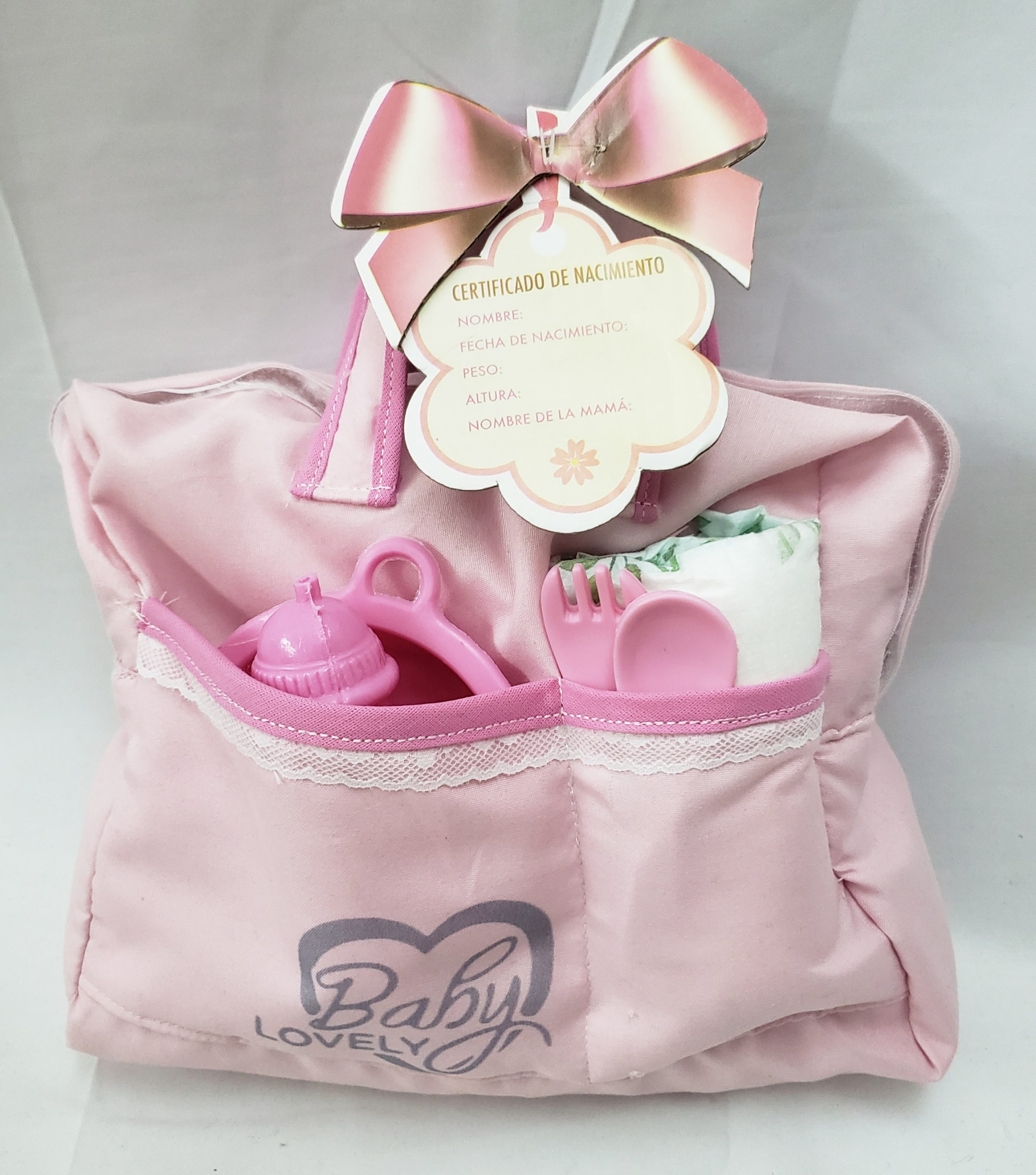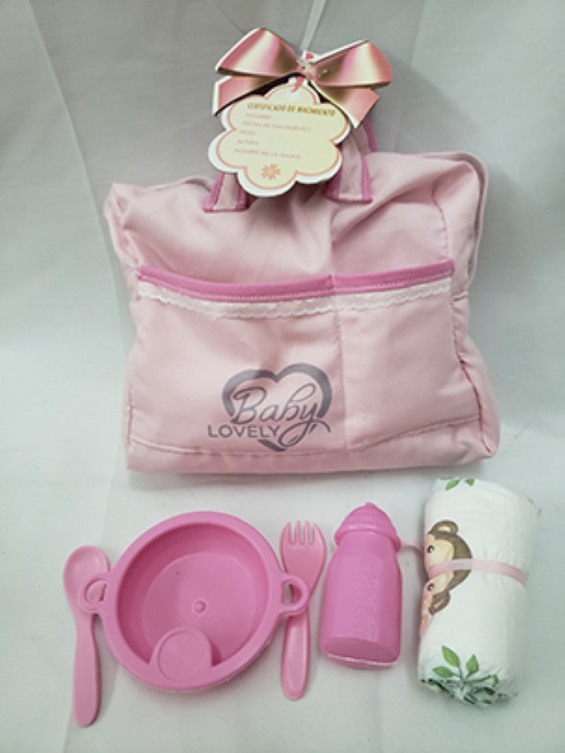 BOLSO CAMBIADOR BABY LOVELY , bolsito de tela con cierre, incluye pañal, mamaderita plástica, platito, tenedor y cucharita plásticos, presentación en bolsa con solapa.