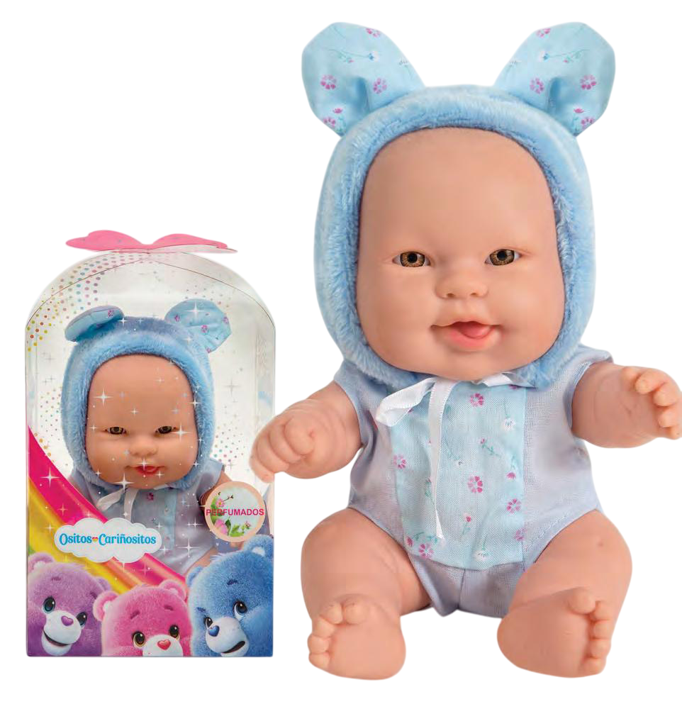 COLECCIÓN MIS CARINITOS DISFRAZ OSITO CARIÑOSO C/AROMA. Bebe articulado, totalmente en plastisol. Mide 25 cm. Con capucha/disfraz de osito de peluche. Perfumado. En estuche cristal transparente.