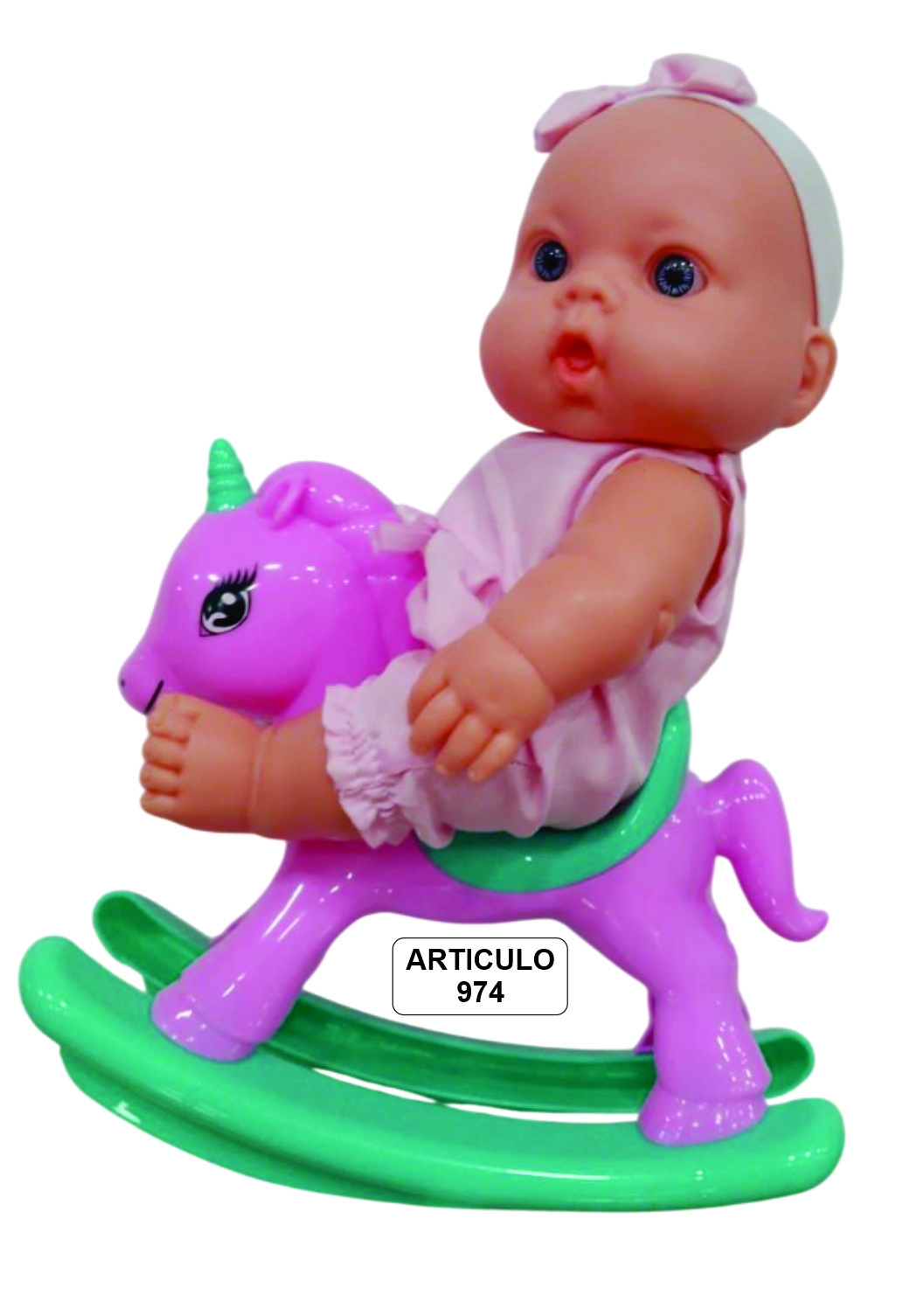 LITTLE BABYC/CABALLITO, bebe de plastisol (semiblando) mide 23 cm, ojos fijos, viene con enterito y vincha con moño, incluye caballito mecedor, viene presentado en bolsa con solapa