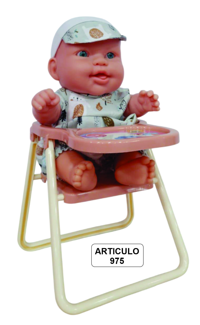 LITTLE BABY CON SILLITA DE COMER bebe de plastisol (semiblando), ojos fijos, mide 23 cm, viene con enterito y vincha con moño o vicerita, incluye sillita de comer, viene presentado en bolsa con solapa