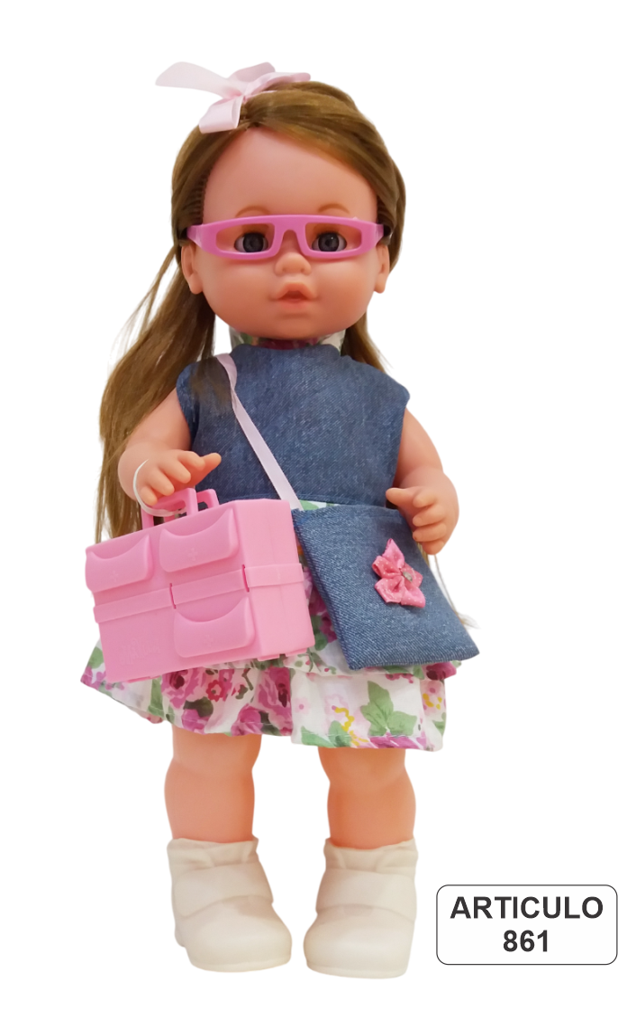 MARICELA, viaja con vos. Muñeca de 40 cm de altura, cuerpo, piernas y zapatitos en plástico rígido, brazos y cabeza en plastisol, con mecanismo de 12 frases. Ojos móviles. con valija, anteojos, carterita.
