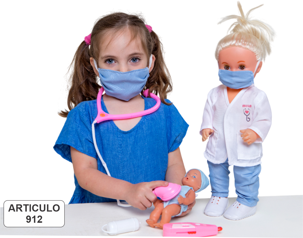 MILA PEDIATRA Muñeca de 40 cm de altura, cuerpo, piernas y zapatitos en plástico rígido, brazos y cabeza en plastisol C/ BEBE Y accesorios.